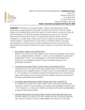 The District of Columbia Public Charter School Board (DC PCSB) announces an opportunity for the public to submit comments on the DC public charter schools listed below which are up for a charter review or renewal on May 18, 2026. Pending DC PCSB staff’s analysis, the Board may elect to do one of the following for schools up for review: 1) continue the school’s charter without conditions, 2) conditionally continue the school’s charter by imposing annual or interim targets or requirements it must meet, or 3) initiate charter revocation proceedings. For schools up for renewal, the Board may elect to do one of the following for each school: 1) renew the school’s charter or 2) not renew the school’s charter.